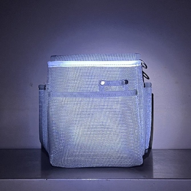 発泡ポリエチレンのラミネートシートをポリエステル織布でサンドイッチ加工した軽くて丈夫な電工袋です。反射材付きで暗所でも視認性バツグン!