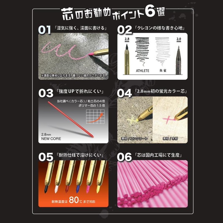 80℃まで耐える熱に強い芯なので、夏場でも芯が溶けずに書くことができます。
